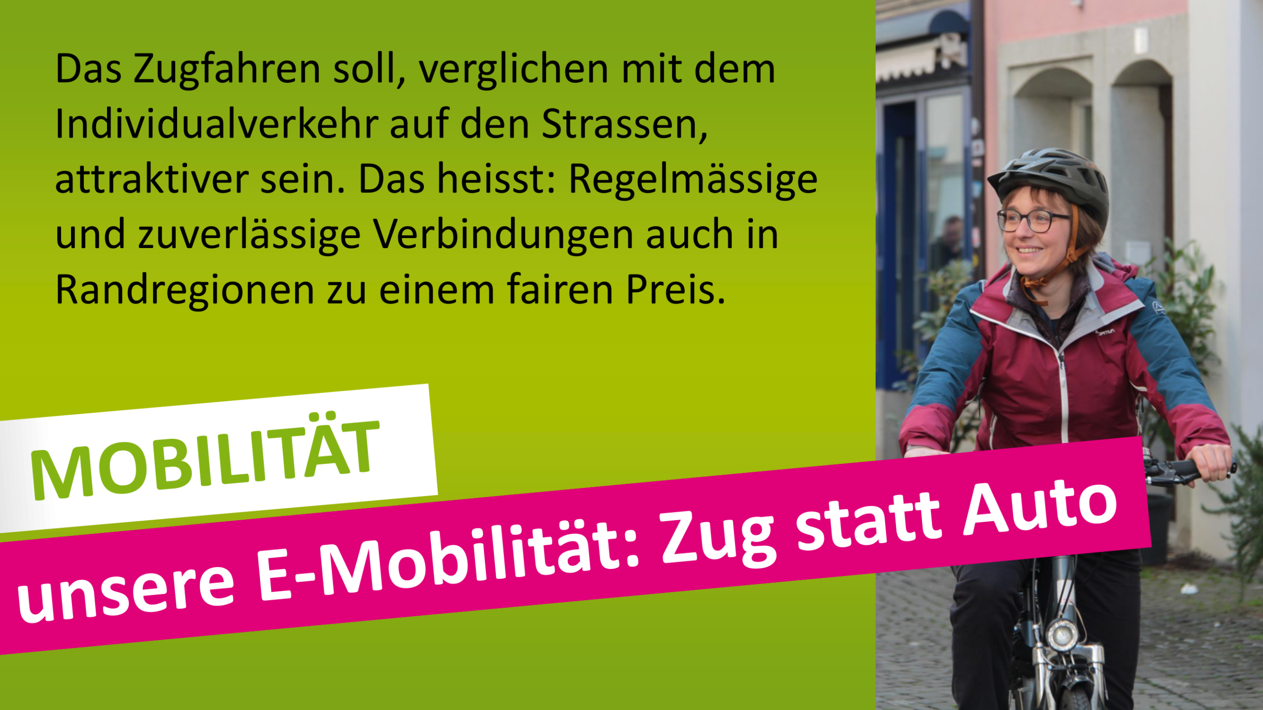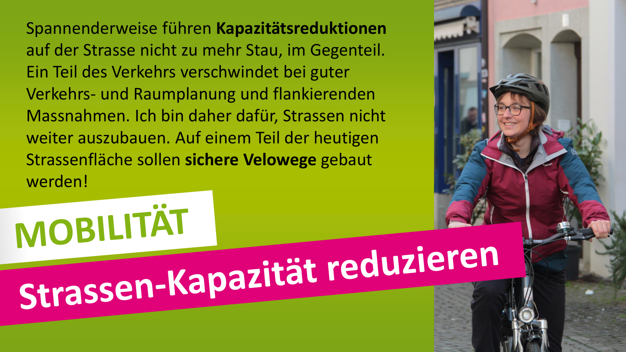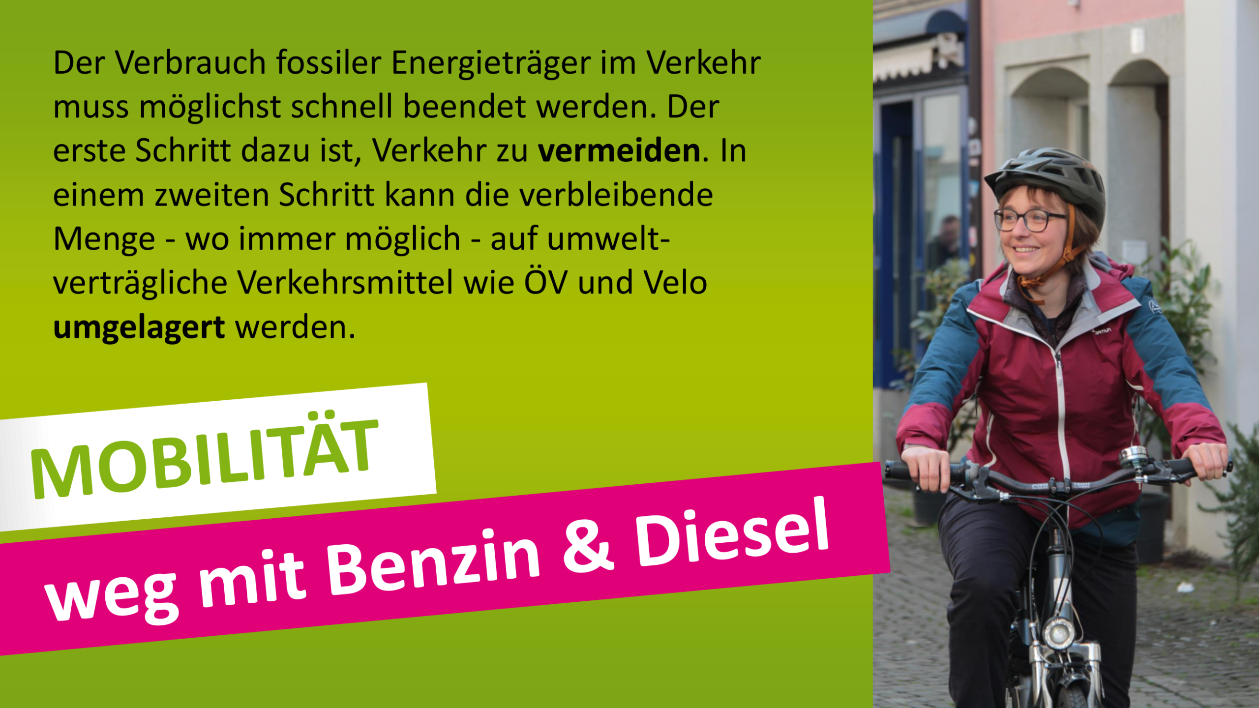 Ich möchte mich einsetzen für eine klimaverträgliche Mobilität mit Schwerpunkt Velo und öffentlicher Verkehr.