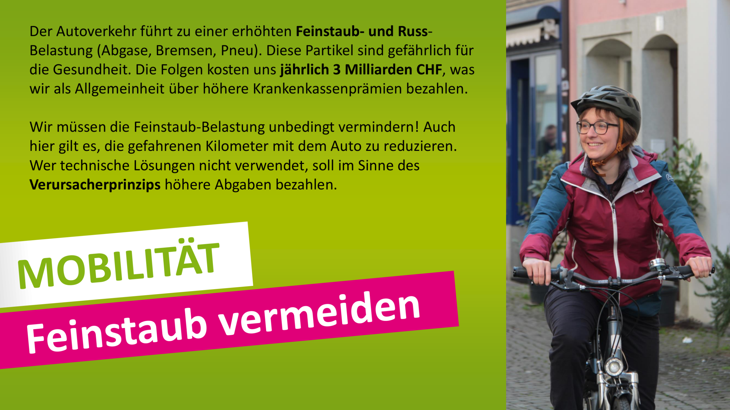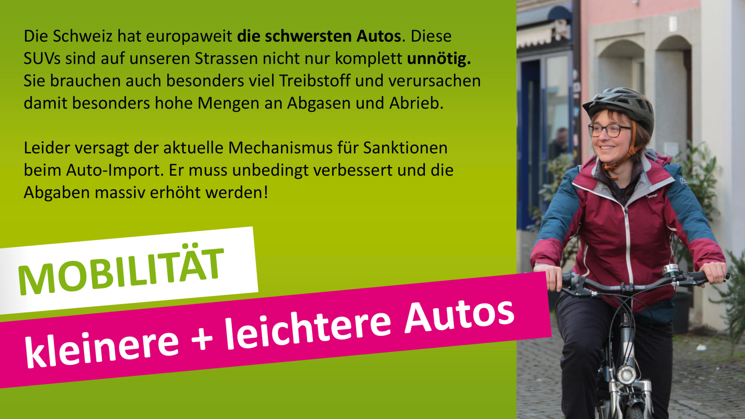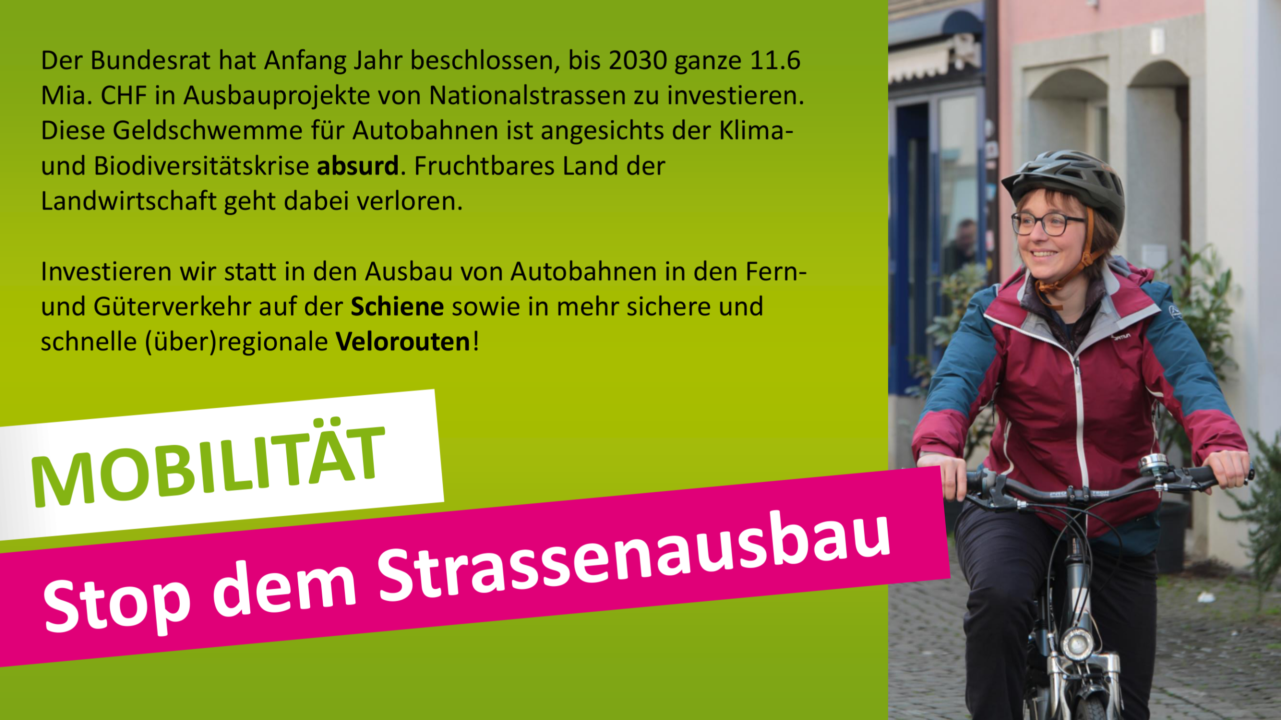 Ich möchte mich einsetzen für eine klimaverträgliche Mobilität mit Schwerpunkt Velo und öffentlicher Verkehr.